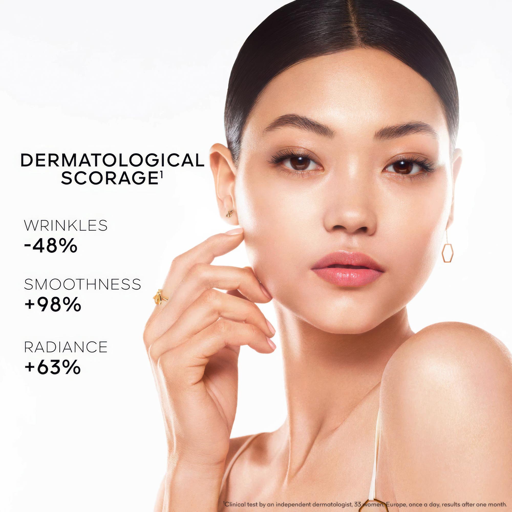 • Clinical Results: +57% firmness, -48% wrinkles, +63% radiance in one month²